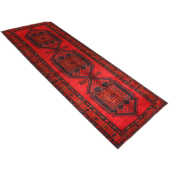 This magnificent semi antique Lori Persian rug, measuring 9'9" x 3'8", presents a commanding geometric composition that captures the nomadic spirit of Persia's mountain tribes. The deep red field serves as a bold foundation for intricate Turkmen Gul medallions, each outlined in rich navy blue and accented with dark red and black details that create stunning visual depth. Dating from 40-60 years ago, this piece represents the transitional period when traditional Lori weaving techniques merged with evolving design sensibilities, resulting in rugs that balanced ancestral patterns with refined color palettes.