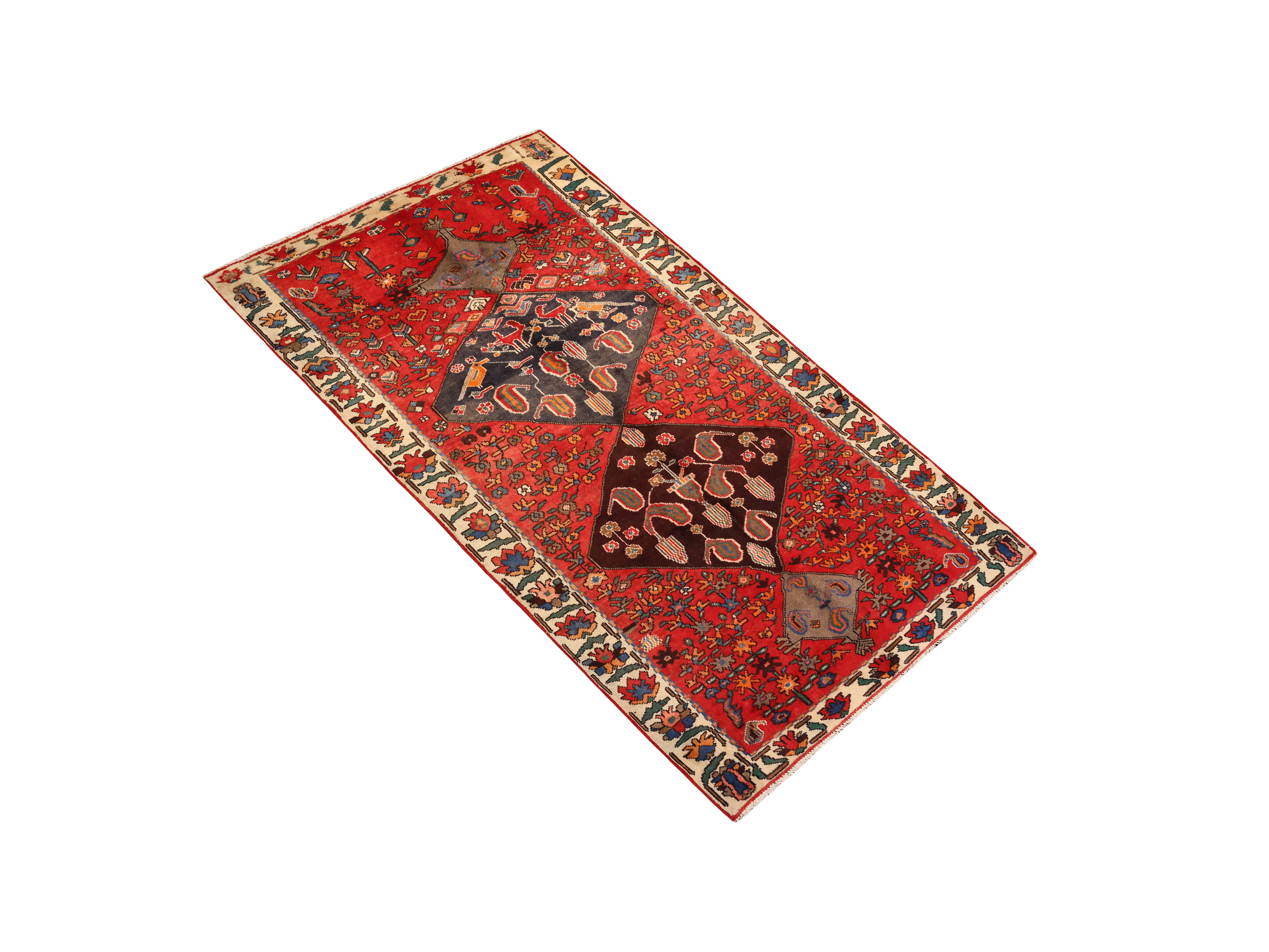 This magnificent semi antique Bakhtiari Persian rug measuring 9'9" x 4'9" presents a stunning medallion design that embodies four to six decades of authentic Persian craftsmanship. The rich madder red field creates a dramatic foundation for the intricate toranj medallion, while cream, navy blue, brown, black, gold, green, and rust red hues dance together in perfect harmony throughout the geometric patterns and diamond lattice motifs.